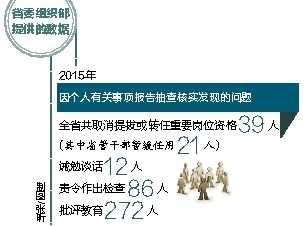 据省委组织部提供的数据,仅2015年一年,因个人有关事项报告抽查核实发现的问题,全省共取消提拔或转任重要岗位资格39人(其中省管干部暂缓任用21人),诫勉谈话12人,责令作出检查86人,批评教育272人。